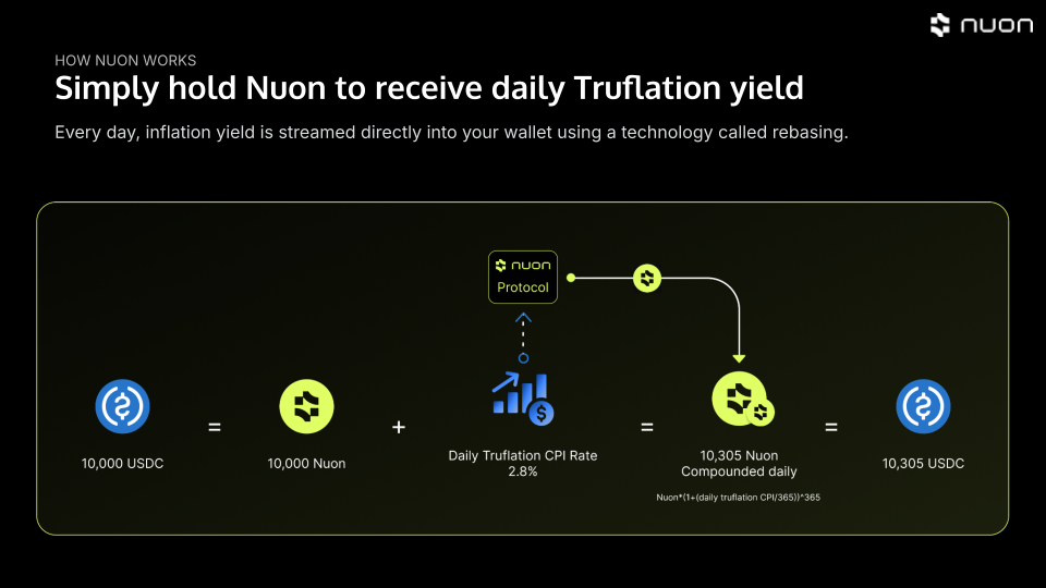 If inflation hedging was all you needed, then you are set. You just received Nuon V2 in your wallet, and the inflation yield will be paid there using a rebase mechanism. You'll receive a yield equal to the current inflation rate (as measured by Truflation) paid out in Nuon for as long as you hold Nuon. It will result in a compounding effect, where your wallet has more and more Nuon, so you receive more and more yield.
