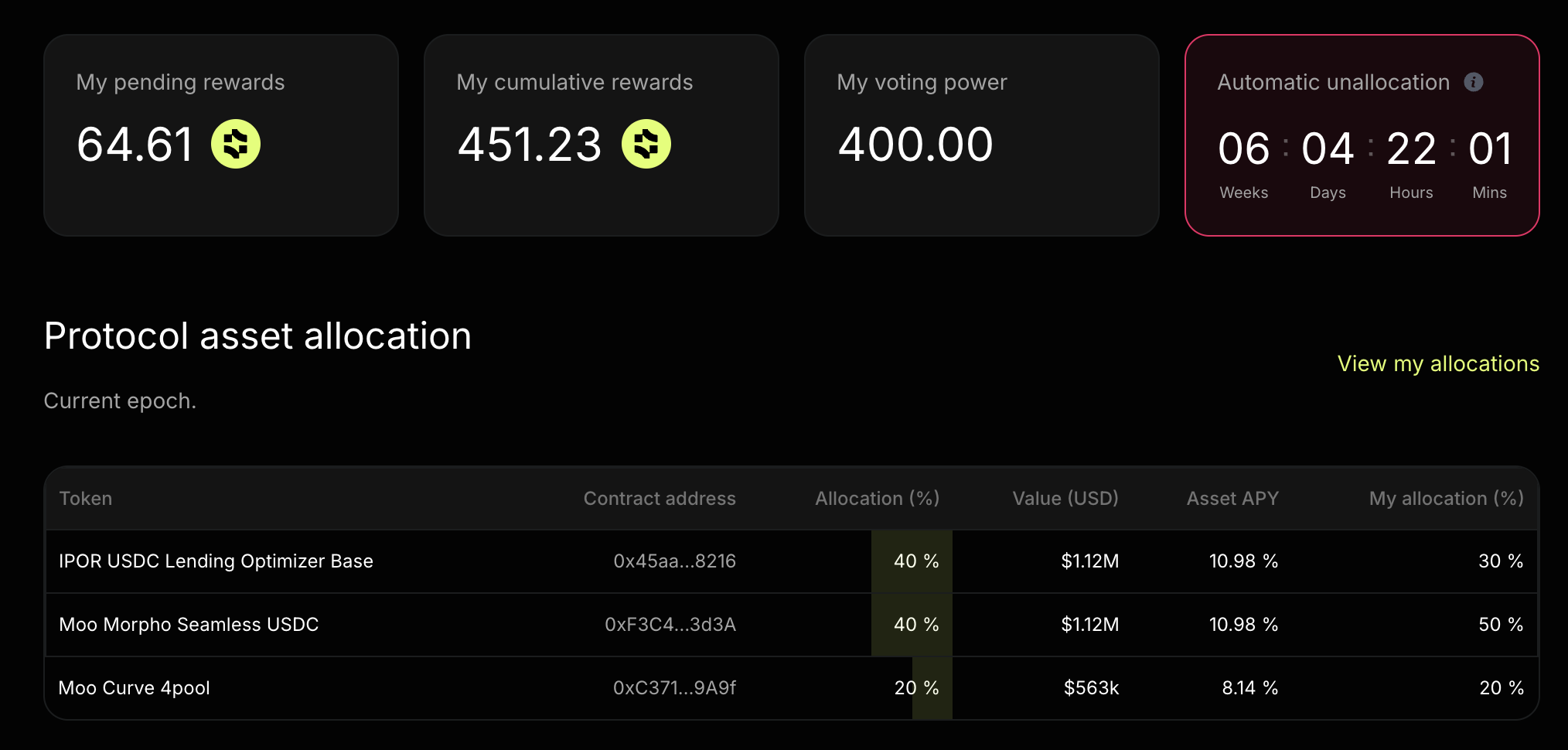 Anyone who stakes the strategy token can become a Risk Curator and start voting on the Nuon protocol allocations for a shot at rewards, although we recommend it only for seasoned DeFi strategists. When they allocate their voting power properly, they should see outsized rewards. However, if they allocate too much risk to the protocol, they lose any gains they made as well as the underlying strategy tokens they staked.