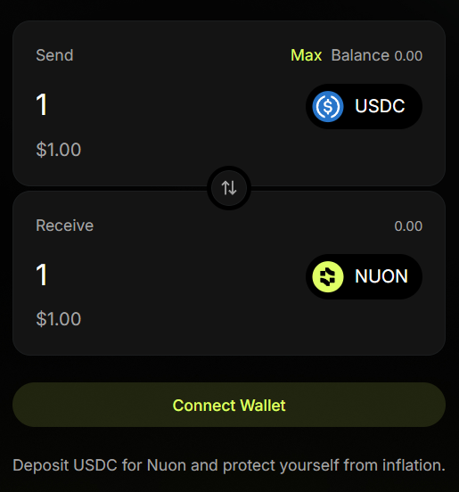 You can mint Nuon directly on the Nuon v2 dashboard using a simple swap transaction and following the instructions of your wallet.