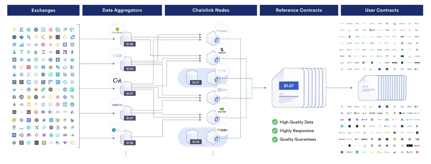 - High-Quality Data—Chainlink Price Feeds source data from numerous premium data aggregators, leading to price data that’s aggregated from hundreds of exchanges, weighted by liquidity depth, and cleaned from outliers and suspicious volumes. Chainlink’s data aggregation model generates precise global market prices that are resistant to API downtime, flash crash outliers, and data manipulation attacks like flash loans.