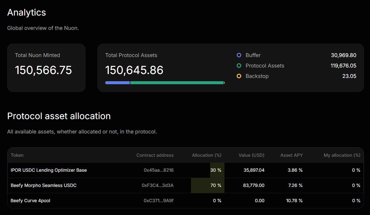 IPOR is the gold standard for on-chain interest rate markets, offering unmatched efficiency, transparency, and reliability. The IPOR Fusion USDC Optimizer, available on Base, automatically allocates capital across top lending protocols, maximizing yields while minimizing risk. By integrating this solution, Nuon ensures: