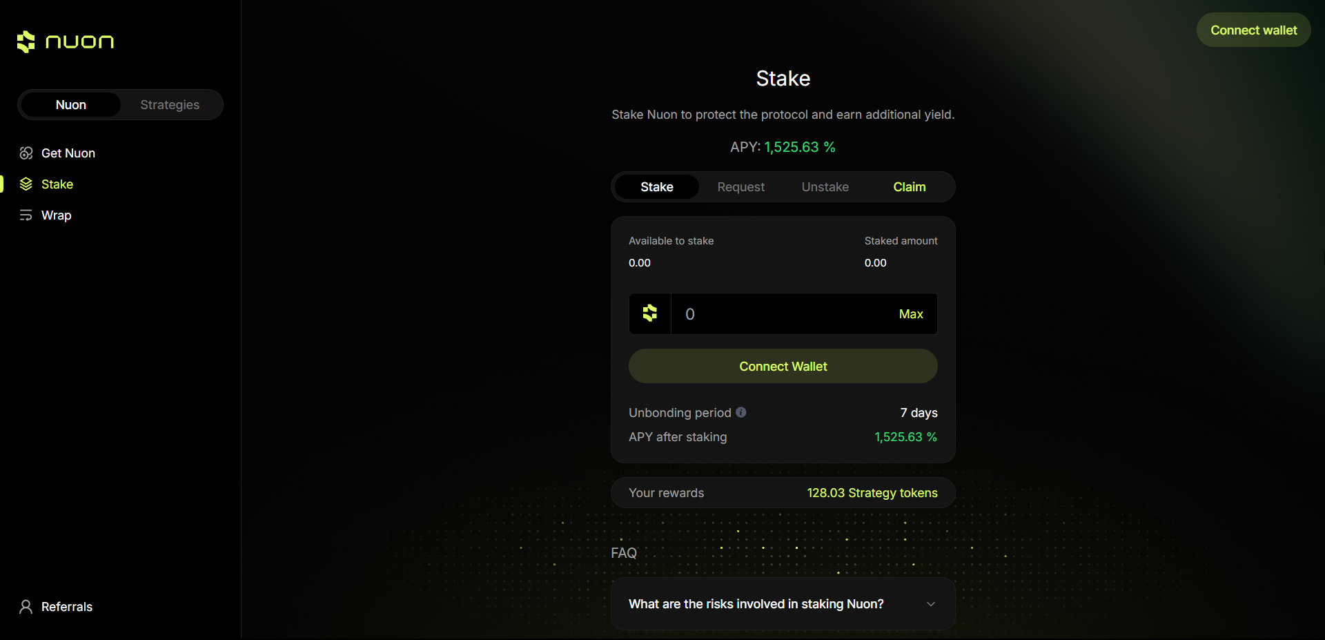 2/ Connect your noncustodial wallet. You'll see that you need to mint and stake a minimum of 100 $NUON.