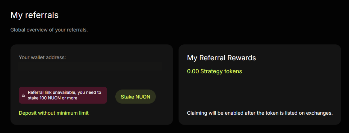 When stakers use your referral link to mint and stake $NUON, you receive a share of the rewards proportional to your referred amount relative to all the referred TVL.