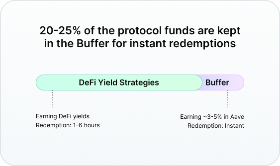 Liquidity Buffer - 20-25% of the protocol funds are kept in a liquidity buffer to enable instant Nuon to USDC redemptions in case of a market crash and bank runs. The Buffer portion of the Nuon assets is allocated into the highly liquid Aave vault, allowing for instant redemptions on Aave, which in turn allow instant redemptions from Nuon to USDC while still earning steady yields of 3-5% (as of Q1 2025).