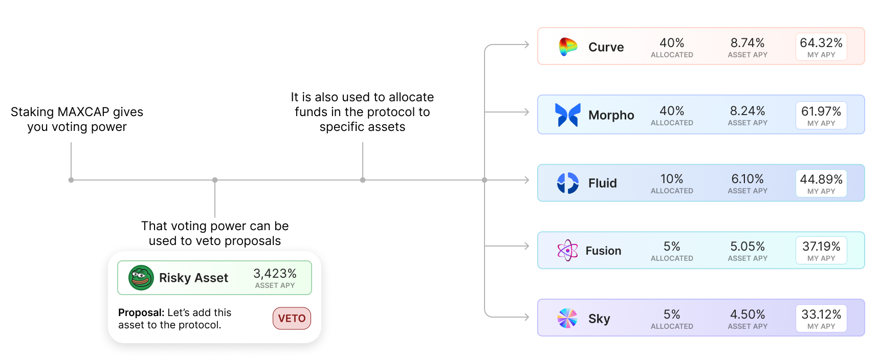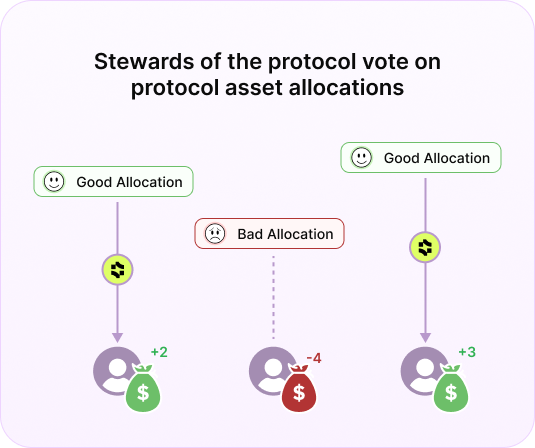 Stewardship Governance and Incentive Design - allocations are voted on by the protocol's Stewards, who own and stake MaxCap tokens to obtain voting power and access to the share of rewards. Stewards of the protocol take on the bulk of the risk and burden of researching allocations and choosing the best yield-bearing assets. The MaxCap incentive design is constructed in such a way that voting on the best assets is highly beneficial while voting on the losing assets is costly. Serial offenders can also be curtailed by other Stewards.