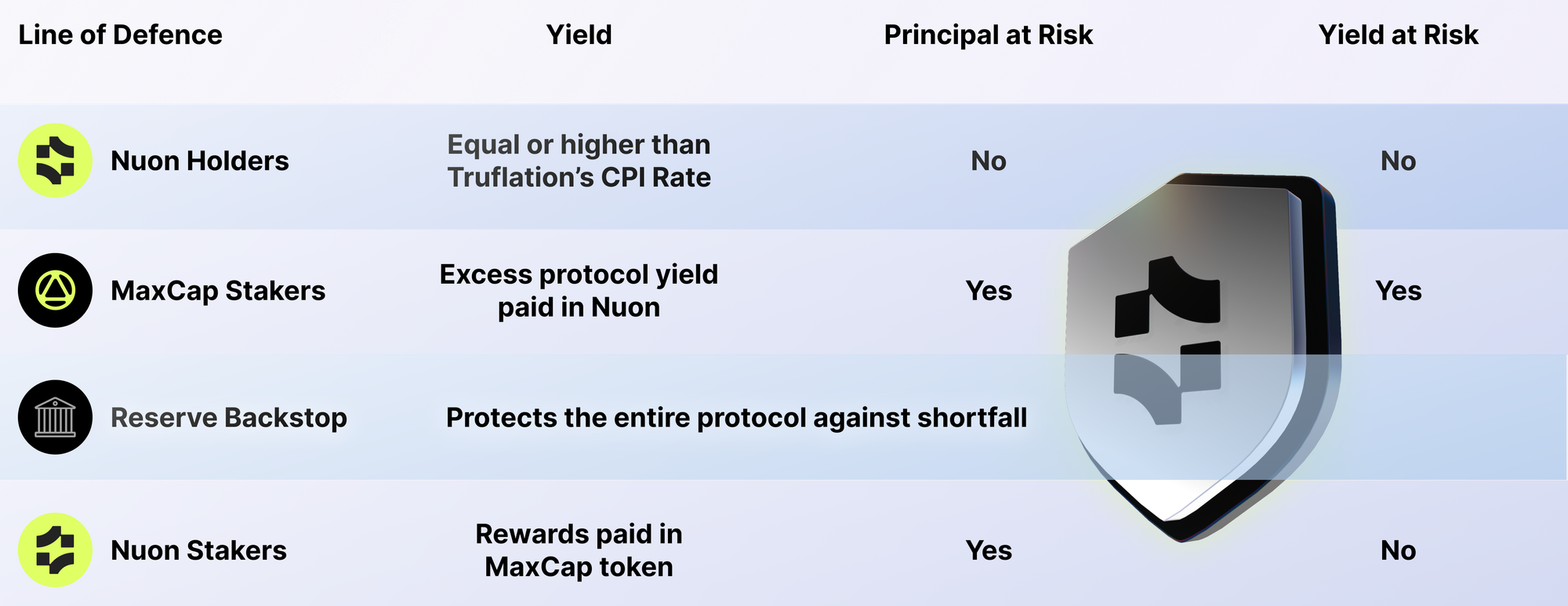 - Reserve Backstop is a protocol allocation into tokenized RWAs and inflation-correlated assets aimed at securing liquidity during difficult economic and market situations. In case of a bigger market or protocol failures, the reserve is used against liquidity shortfalls and yield losses, or when the generated yield is not sufficient to cover inflation yields for Nuon holders.