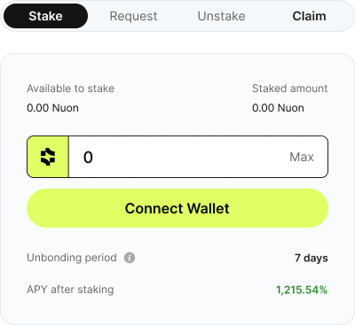- Nuon Stakers partake in an extra percentage of the excess yields generated by the protocol, but in exchange, they lock their capital for 21 days, and they agree to insure the protocol. Their Nuon yields accrue where their Nuon is stored, so in case of a hack, liquidity crunch, or market crash that affects the viability of the protocol, both their capital and rewards are at risk and can be used to ensure the safe exit for the Nuon holders. Nuon Stakers are medium-to-high risk-reward ratio users and agree to serve as the last line of defence in case of serious events.