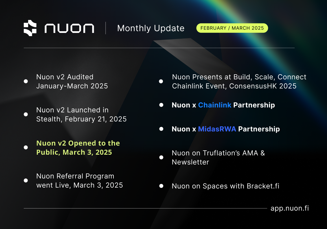 In the past month, Nuon has successfully launched the Nuon v2 protocol, expanded its ecosystem of partners to Chainlink and Midas, and featured across real-life and virtual events.